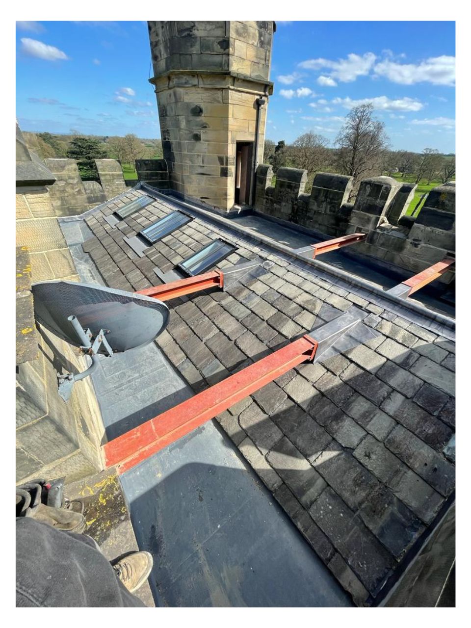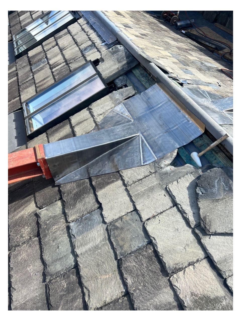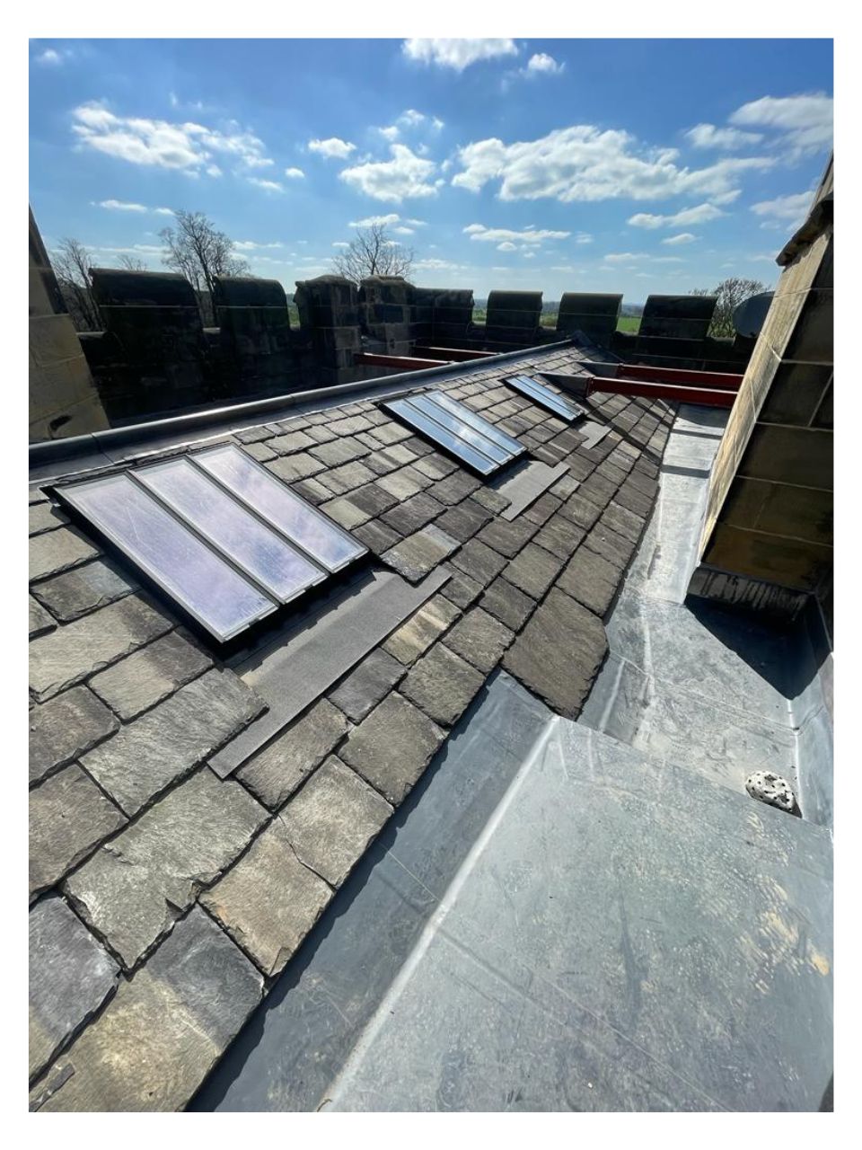 We re-used the existing slates with great effect. The salvage rate on the existing slates was poor, however we were able to find very closely matching slates at the reclamation yard for a seamless blend. To the horizontal valley gutters we used a modern single ply membrane to meet the planning constraints - the old linings were lead but the client needed to save funds and we were able to accommodate this with the single ply membrane. The client required a hot tub on the roof terrace and this was sited on the large steels running directly through the pitched roof, a tricky detail but nothing that our lead men couldn’t handle. Another project handed over successfully.