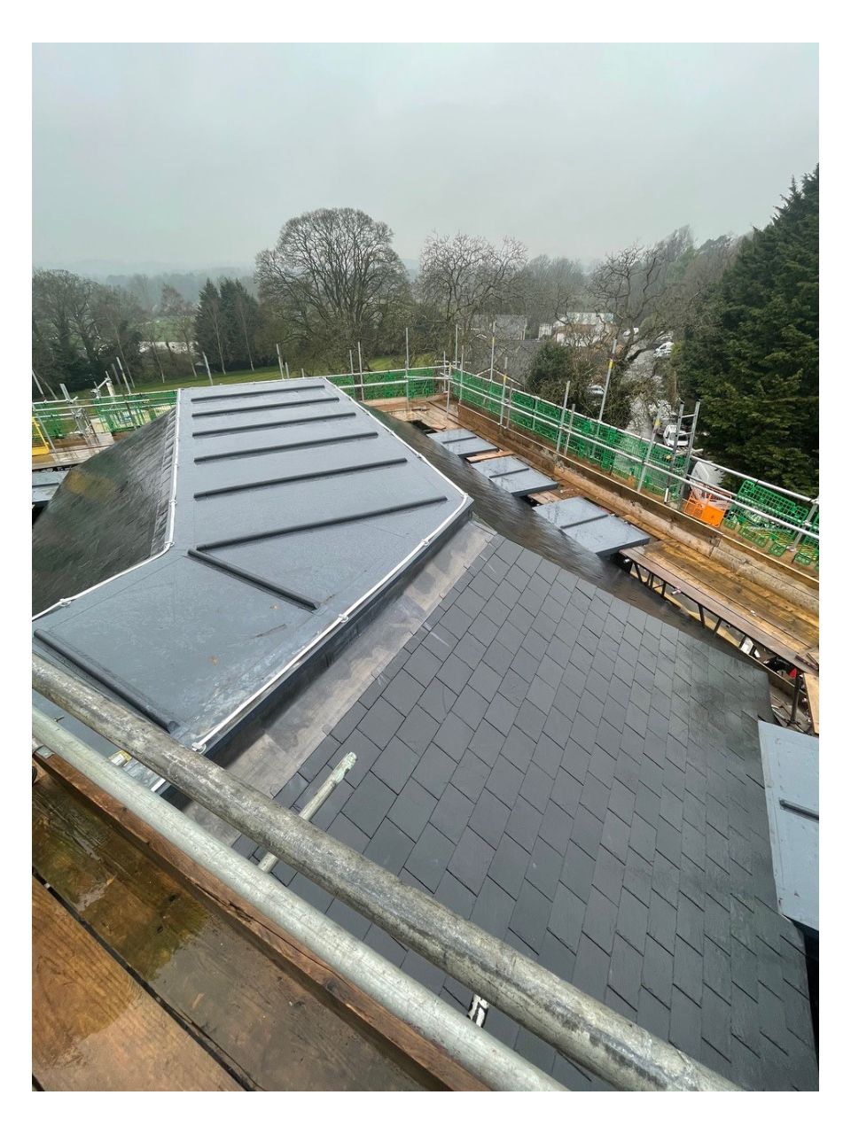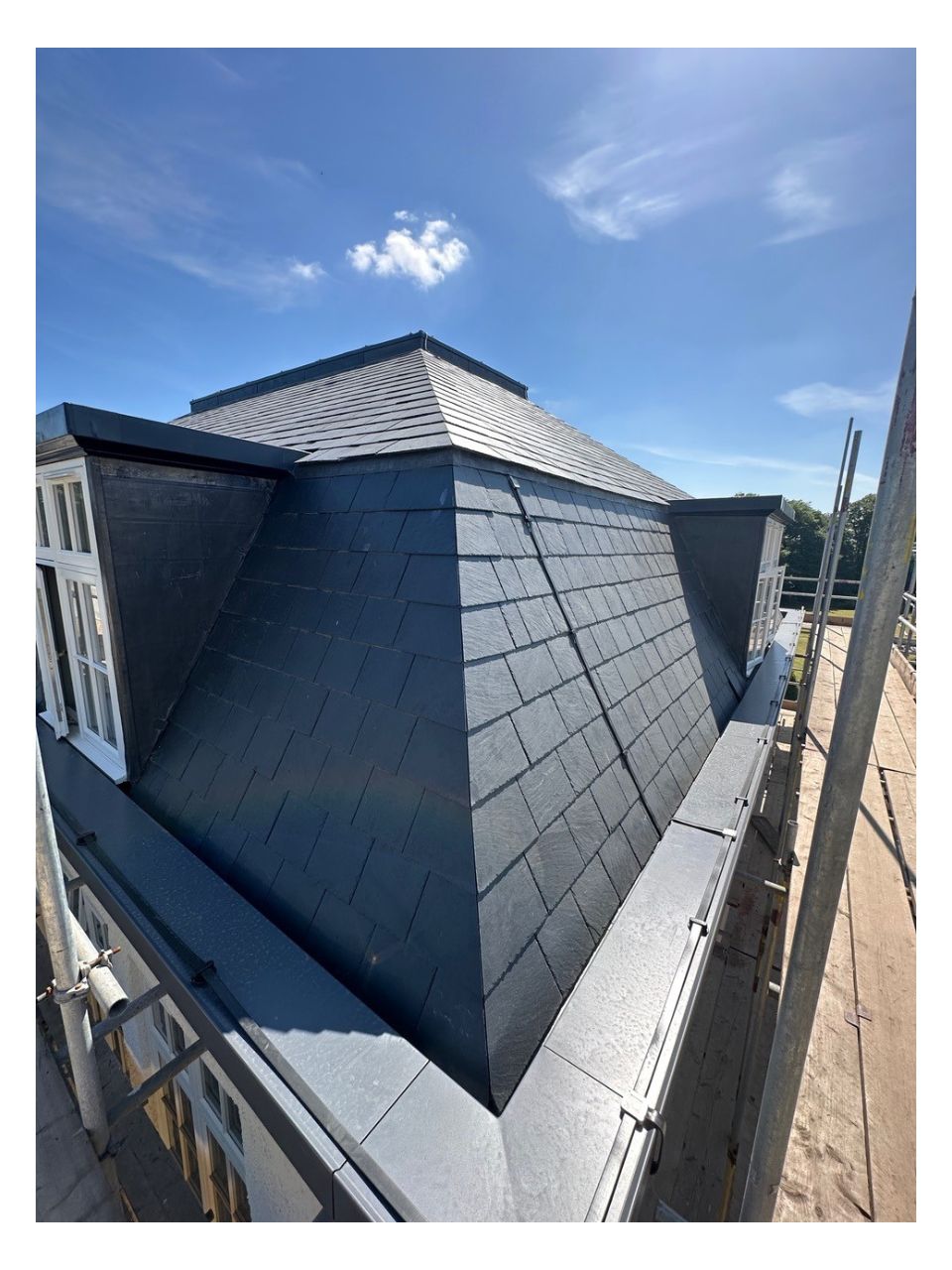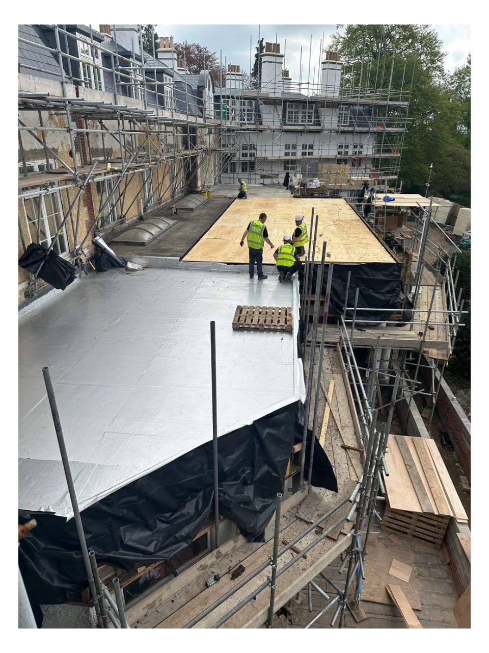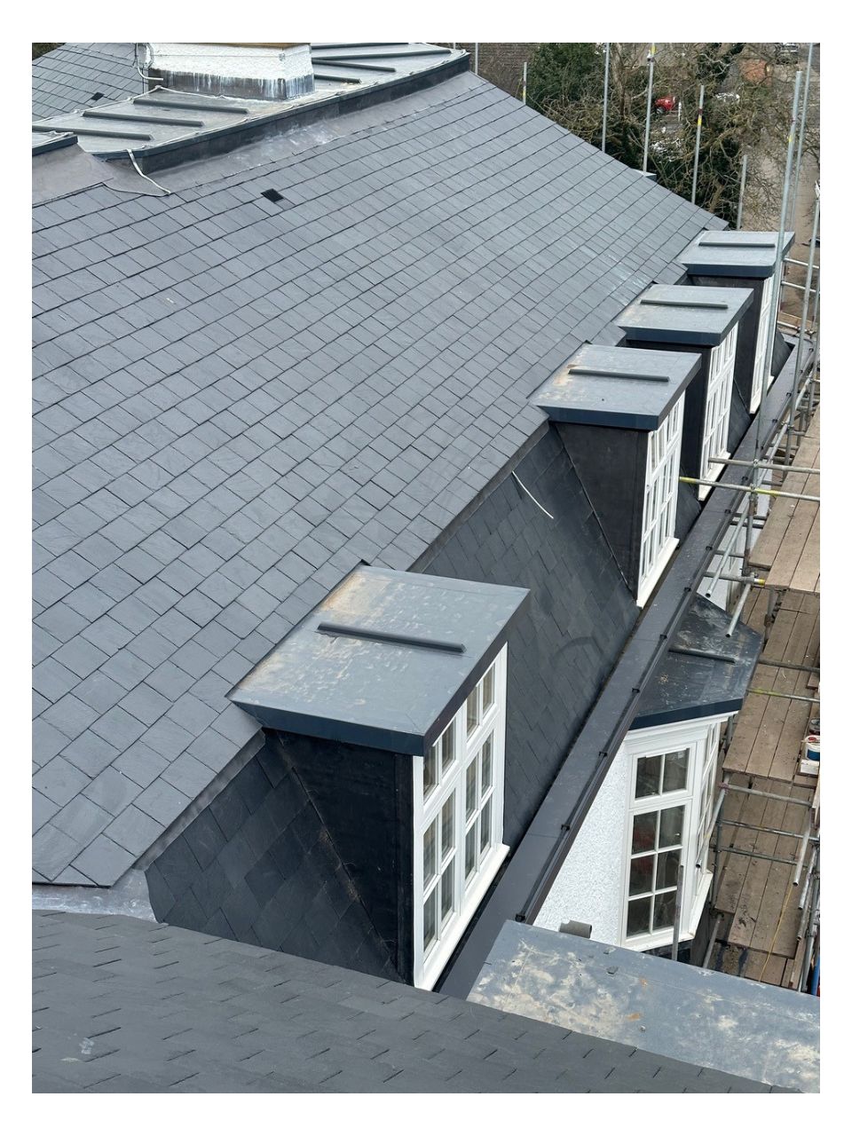 We carried out a full replacement to all pitched and flat roofs, along with the re-lining of the gutters with aluminium profiled pressings and all lead flashings. We used a variety of different materials such as natural slates, self adhesive built up felt, single ply membranes and bespoke lead fabrication in order to meet the planning requirements.