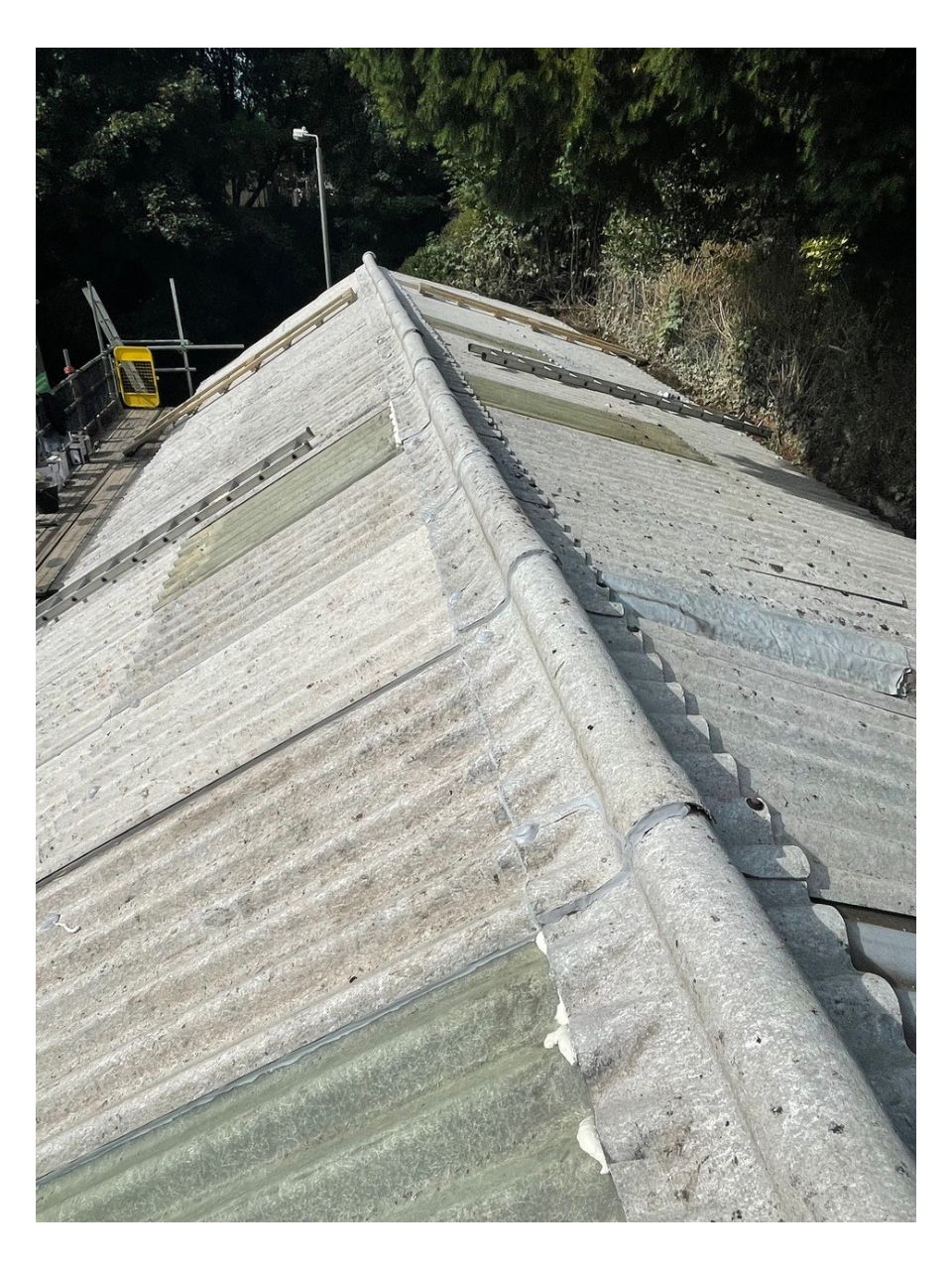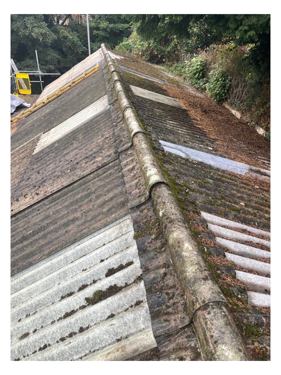 Over treatment to an aged existing asbestos roof at a veterinary practice. This method offers a very cost effective solution to asbestos removal and installation of new panels.