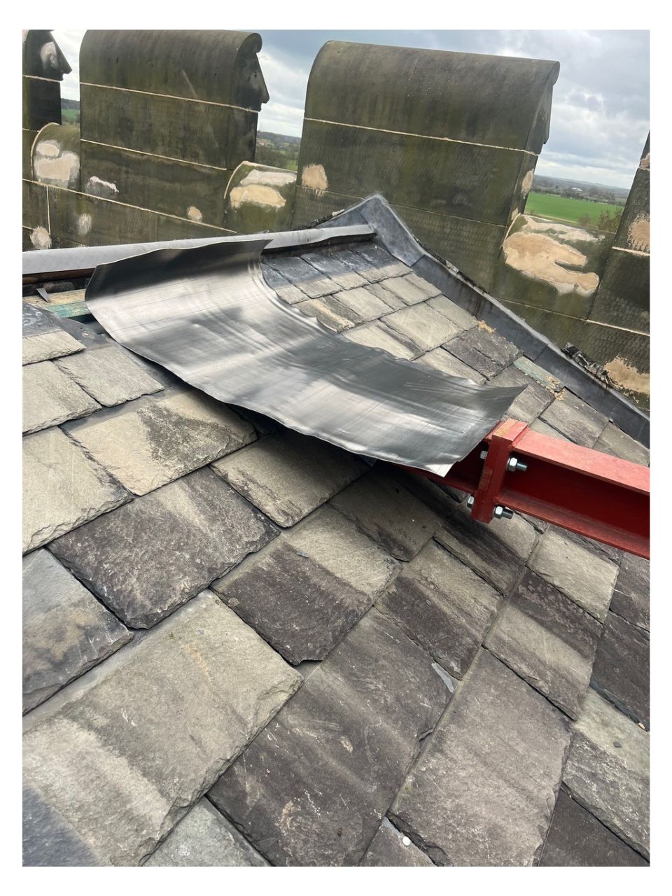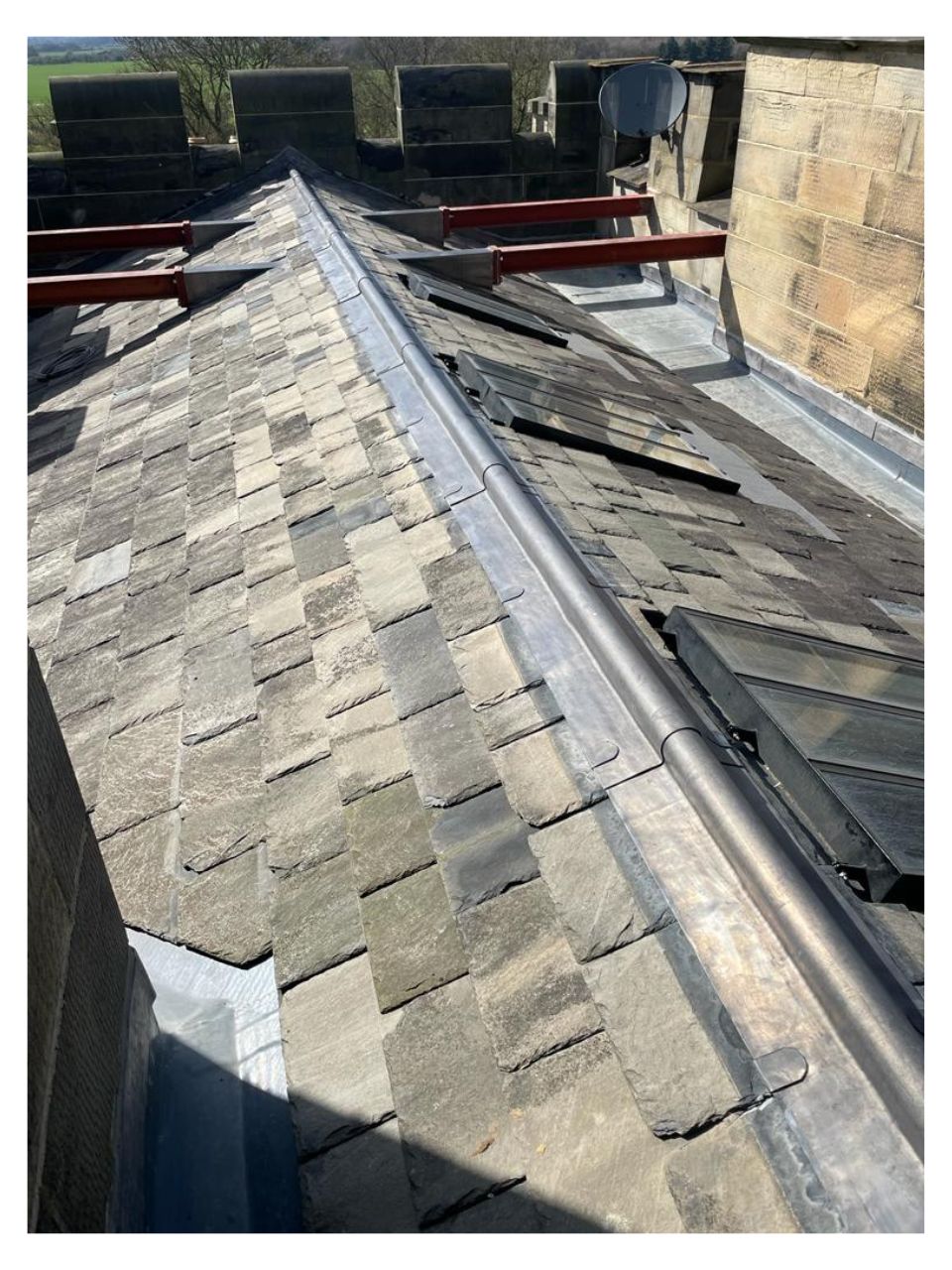 We re-used the existing slates with great effect. The salvage rate on the existing slates was poor, however we were able to find very closely matching slates at the reclamation yard for a seamless blend. To the horizontal valley gutters we used a modern single ply membrane to meet the planning constraints - the old linings were lead but the client needed to save funds and we were able to accommodate this with the single ply membrane. The client required a hot tub on the roof terrace and this was sited on the large steels running directly through the pitched roof, a tricky detail but nothing that our lead men couldn’t handle. Another project handed over successfully.